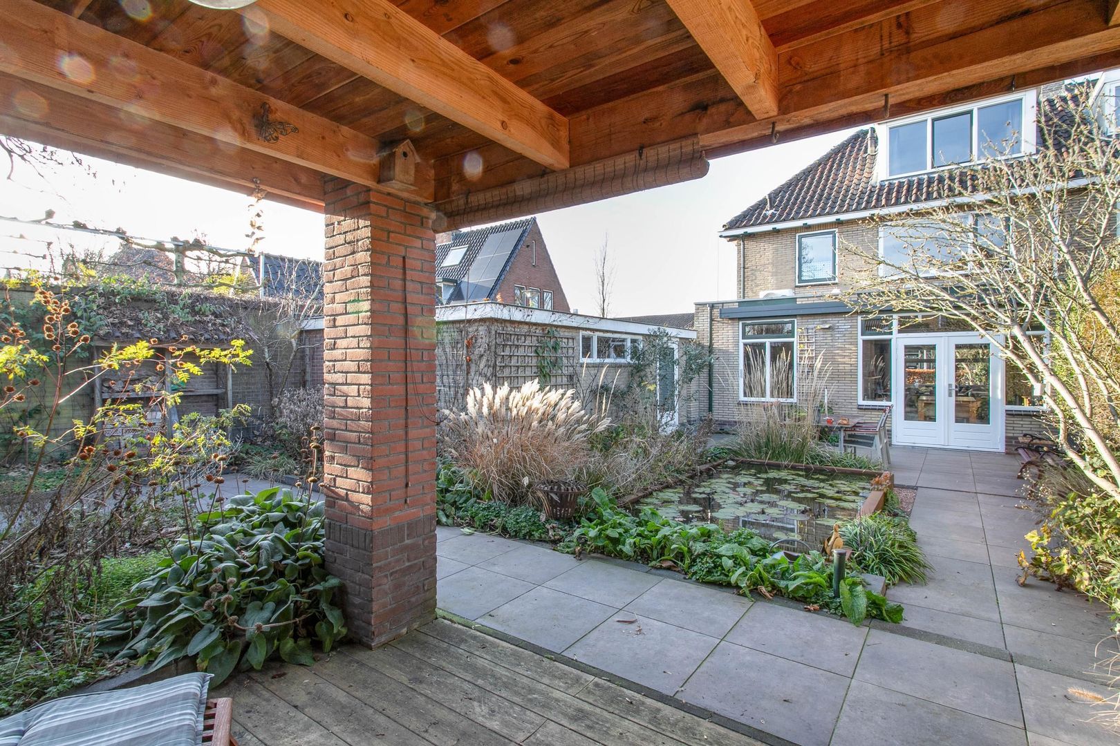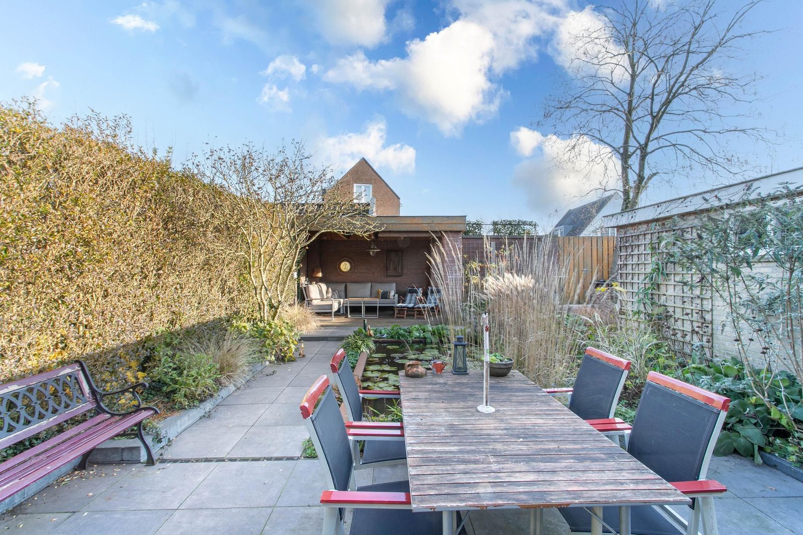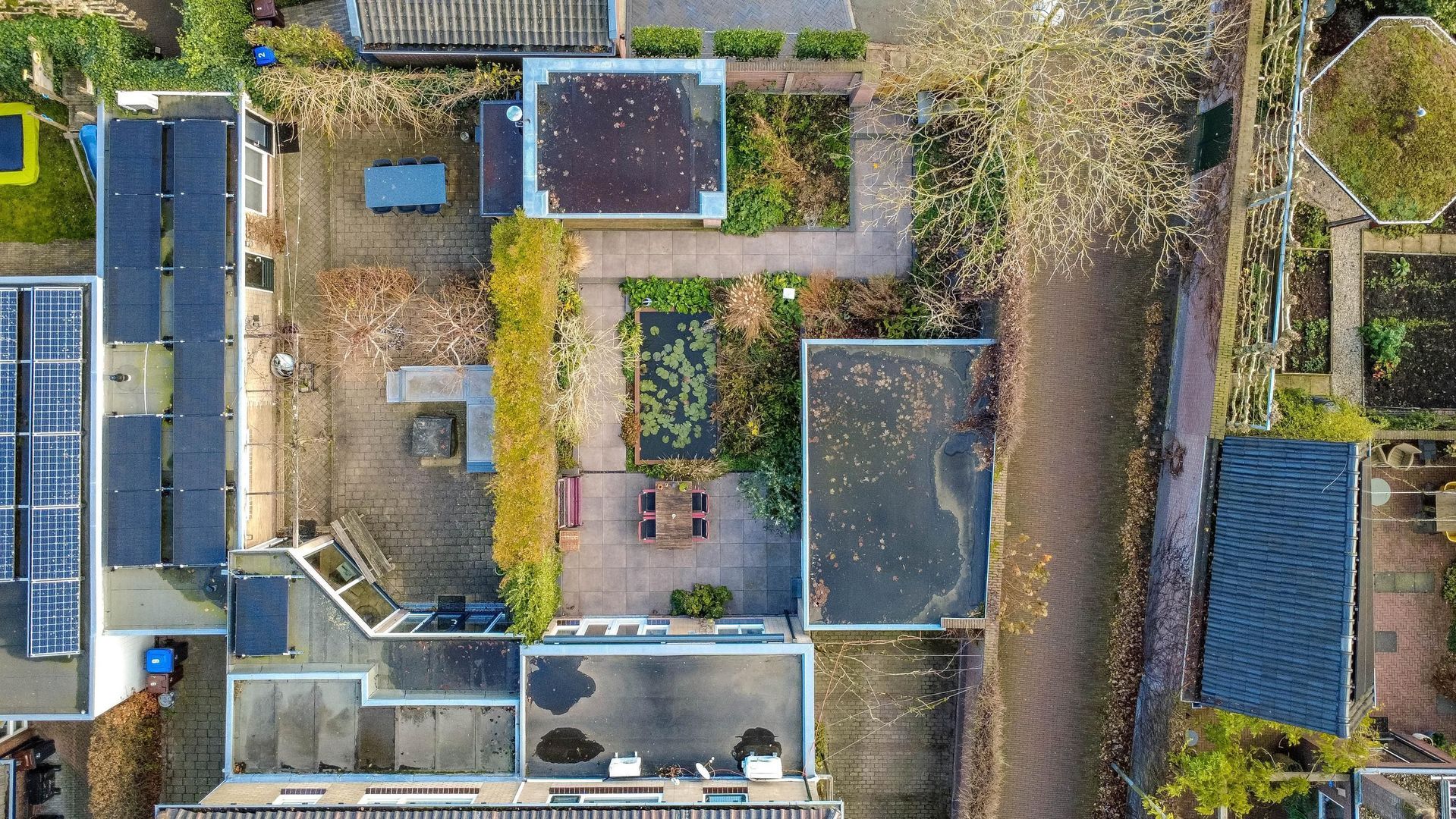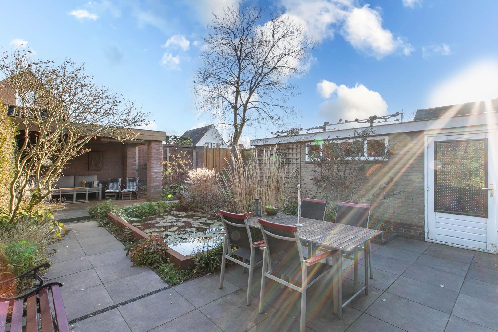 De voortuin is ruim opgezet, voorzien van een leuke zitplaats voor de woning en voldoende plek voor begroeiing. De royale achtertuin heeft de hele dag zon en is voorzien van zowel zitplekken overdekt, in de heerlijke veranda, als in de zon. Met een vijver in de tuin, maakt dit de sfeer van het buitenleven compleet. Verder is het via hier ook mogelijk de garage te betreden. De garage is ruim en biedt een ruime werkplaats en veel bergruimte voor o.a. fietsen. Er is een vast aanrechtblad met stromend water en afvoer.
