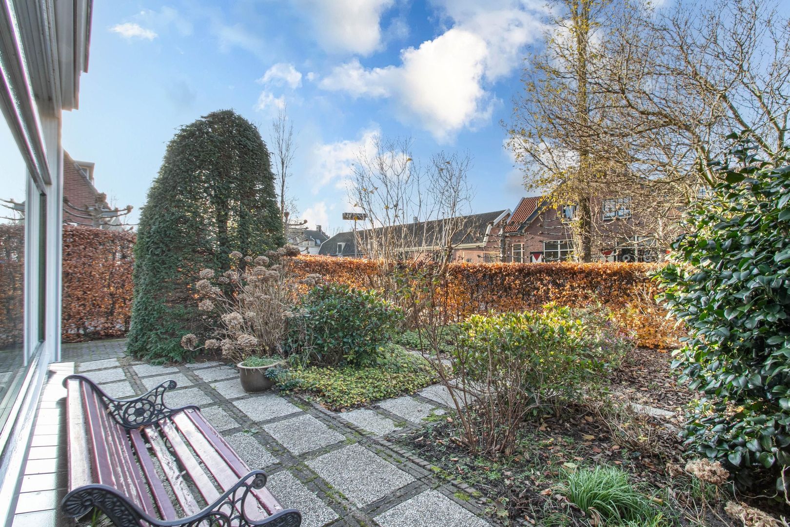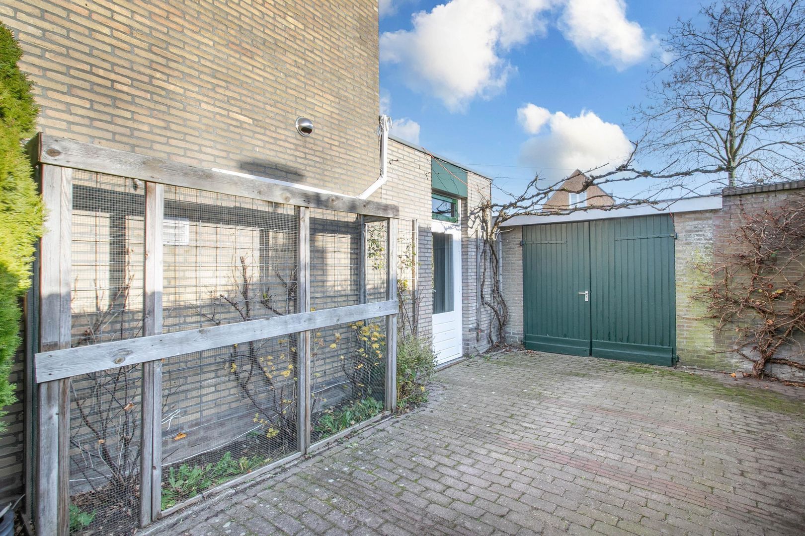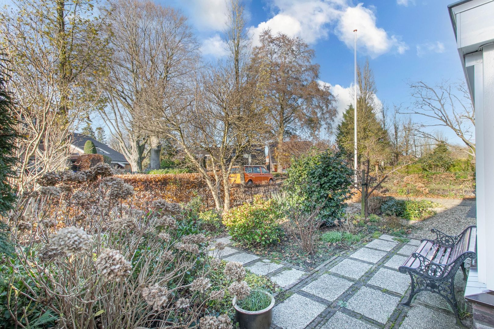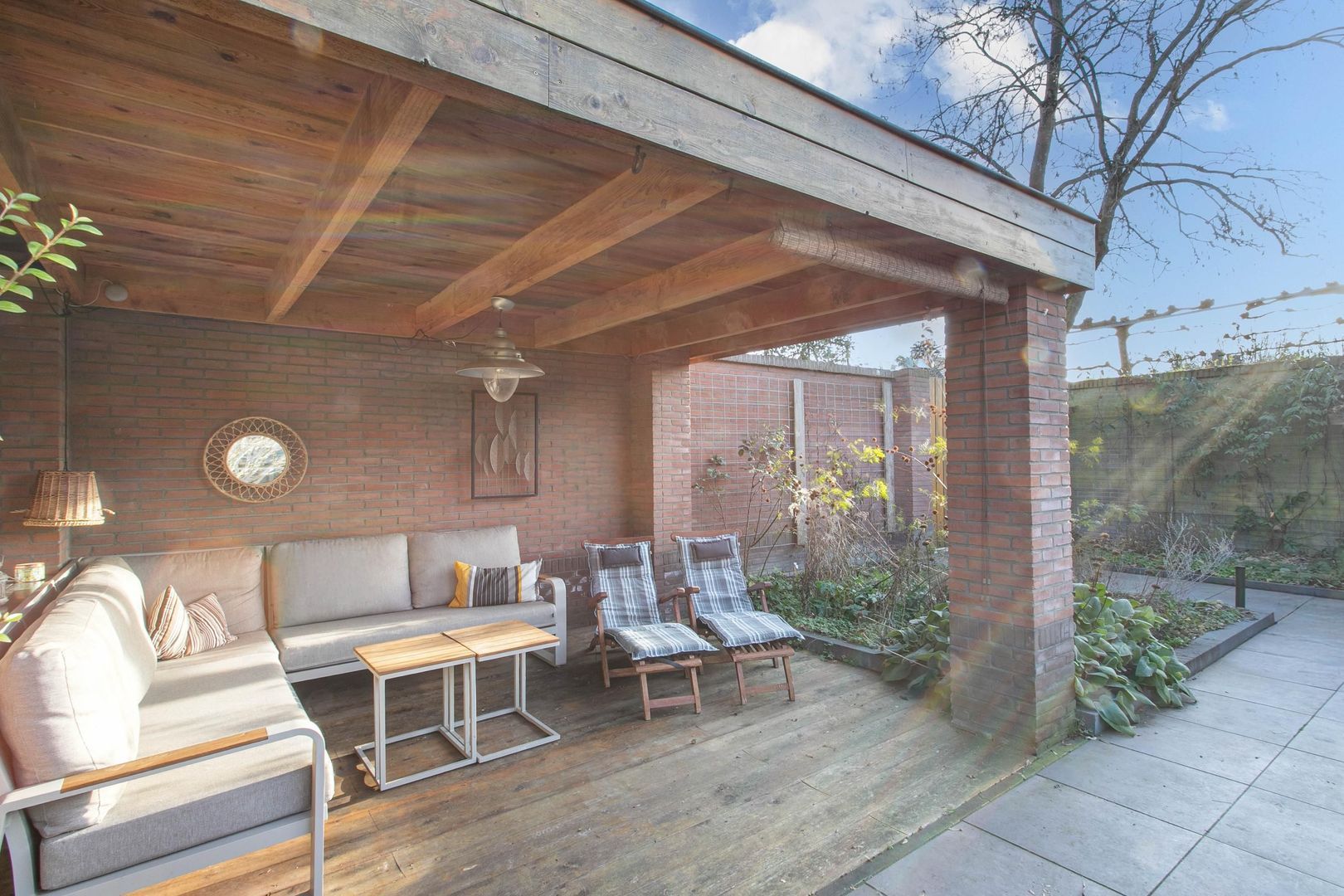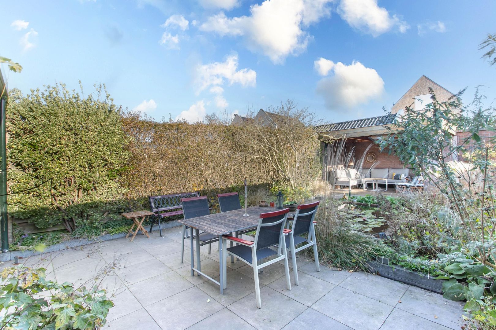 De voortuin is ruim opgezet, voorzien van een leuke zitplaats voor de woning en voldoende plek voor begroeiing. De royale achtertuin heeft de hele dag zon en is voorzien van zowel zitplekken overdekt, in de heerlijke veranda, als in de zon. Met een vijver in de tuin, maakt dit de sfeer van het buitenleven compleet. Verder is het via hier ook mogelijk de garage te betreden. De garage is ruim en biedt een ruime werkplaats en veel bergruimte voor o.a. fietsen. Er is een vast aanrechtblad met stromend water en afvoer.