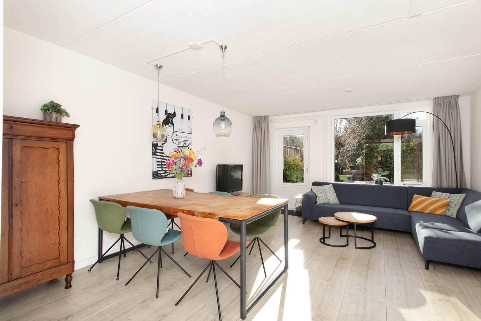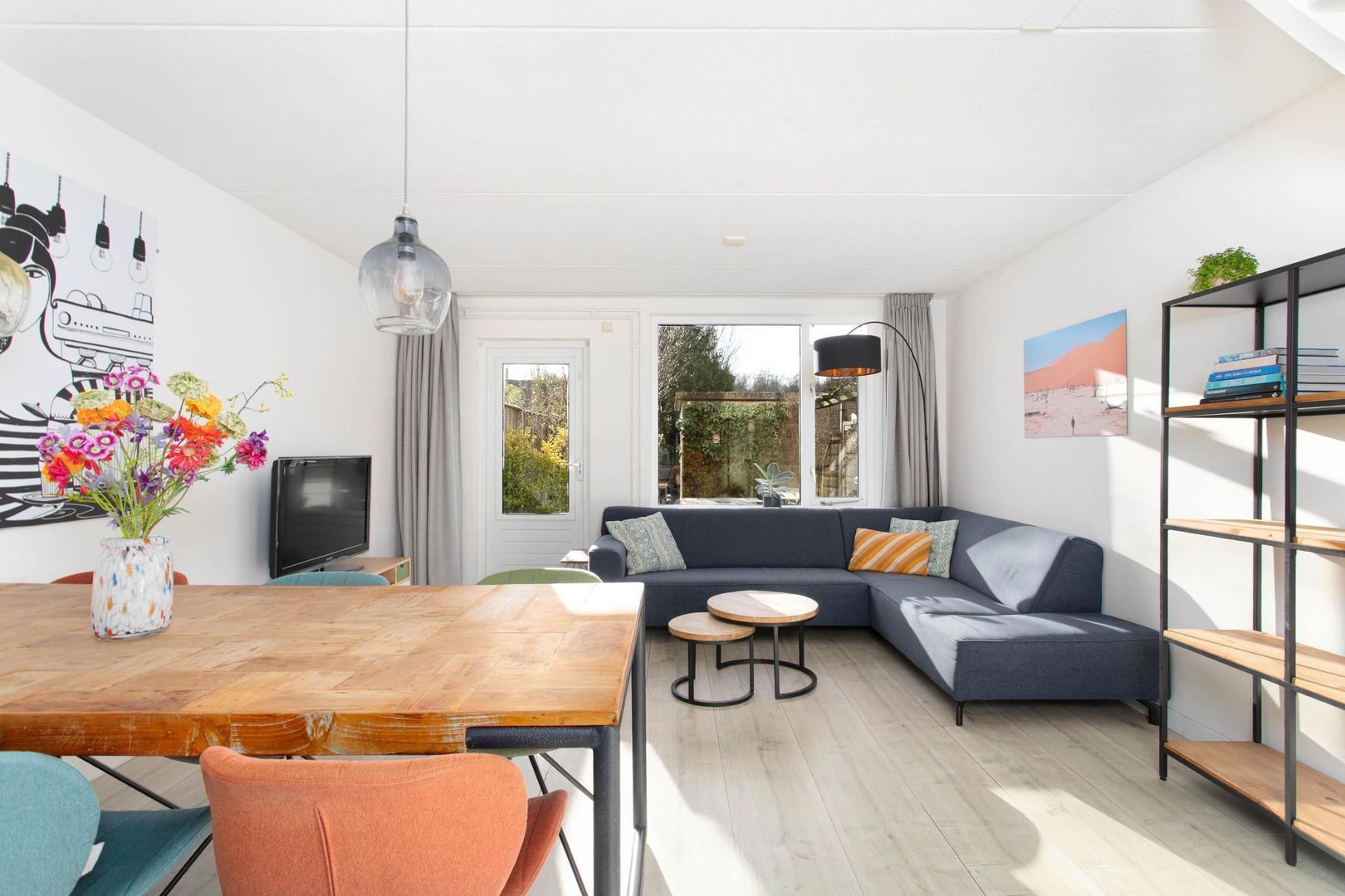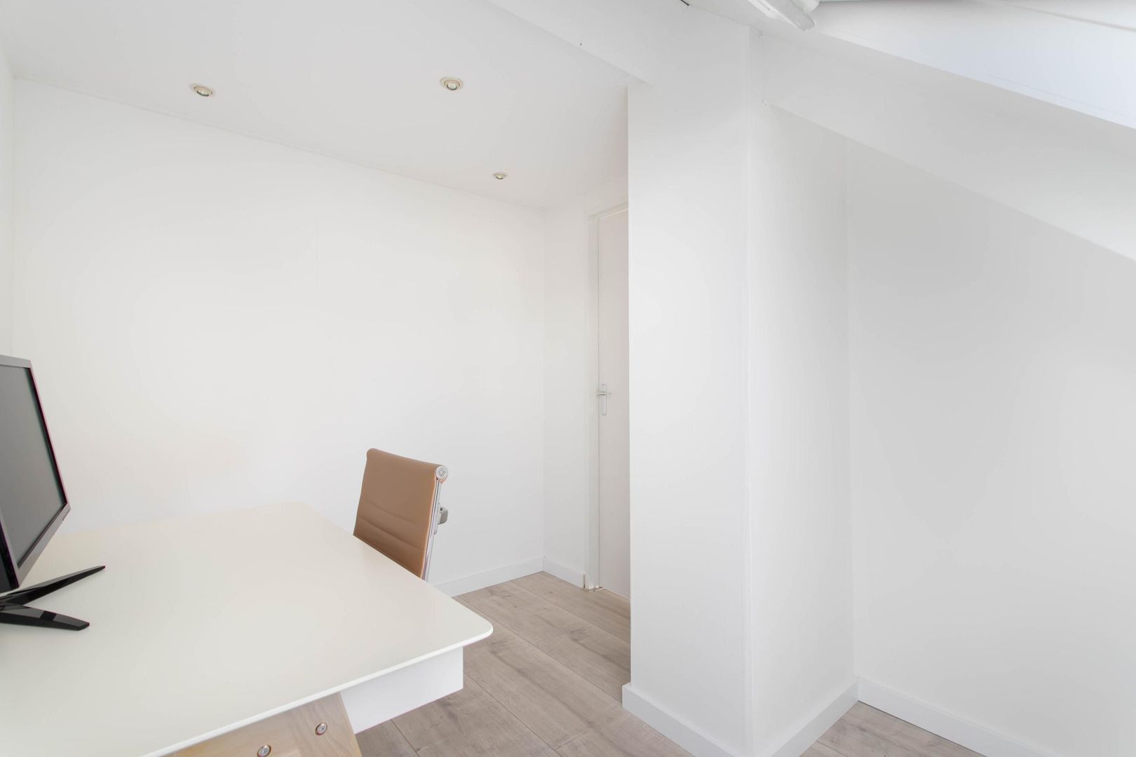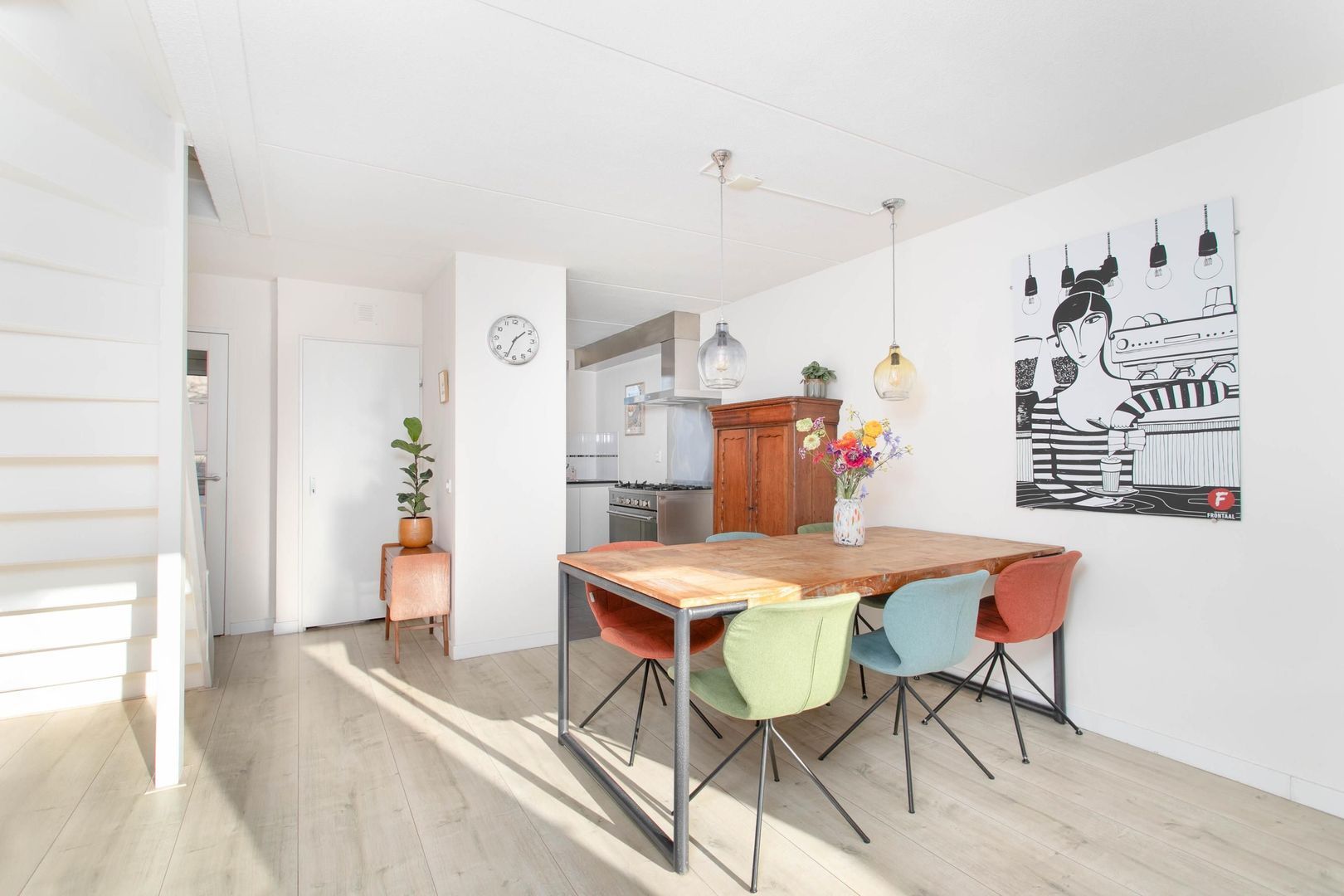 Zeer lichte, moderne en gezellige woonkamer voorzien van een lichte laminaatvloer. Tevens bevindt zich hier de meterkast. De trap in de woonkamer leidt naar de eerste verdieping.