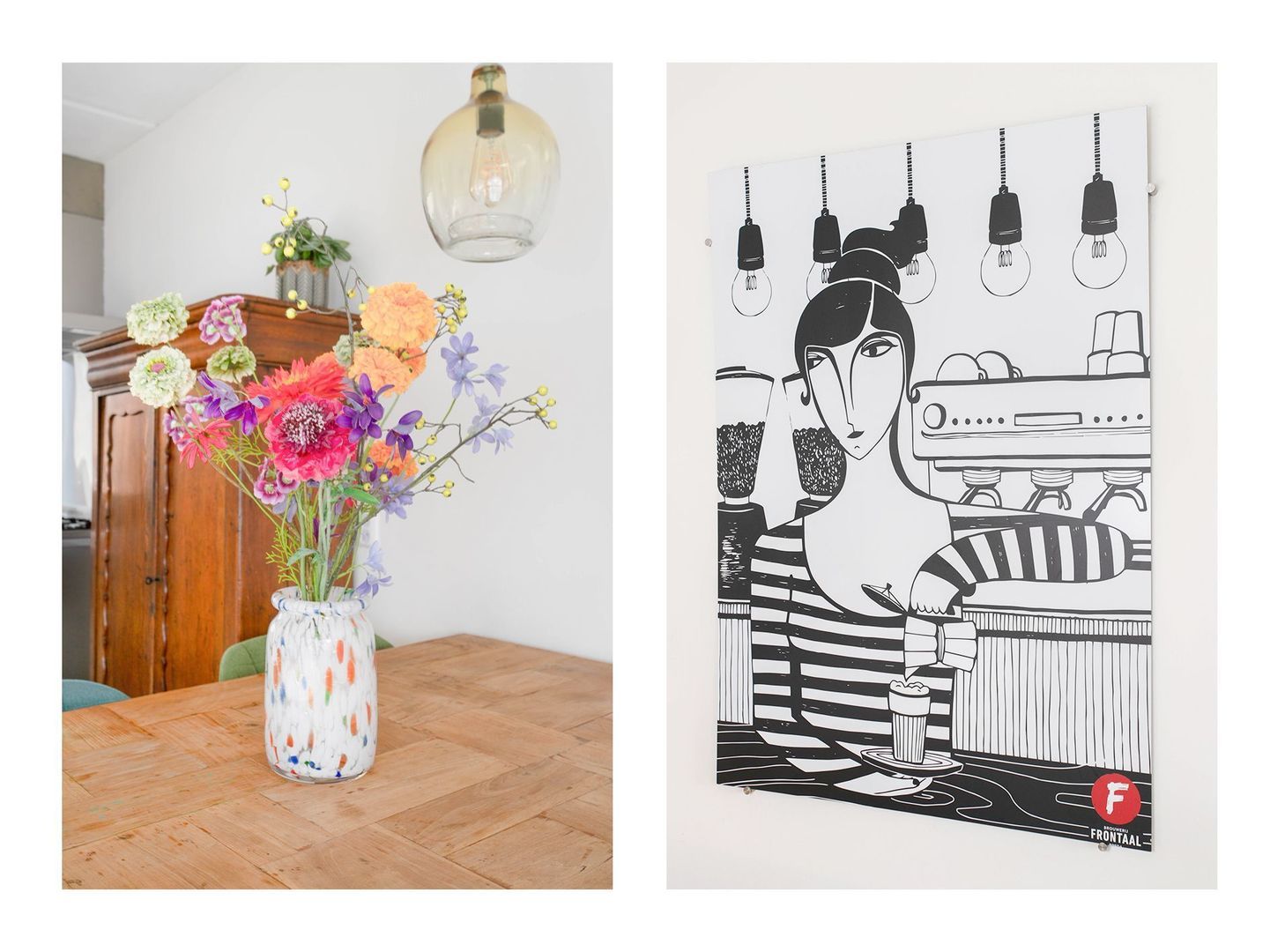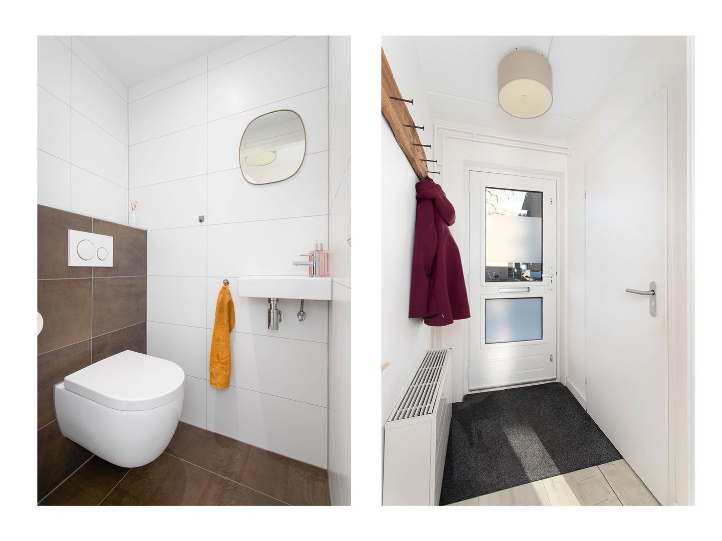 Hal met garderobe, toiletruimte (wandcloset en fonteintje) en toegang tot de woonkamer.
