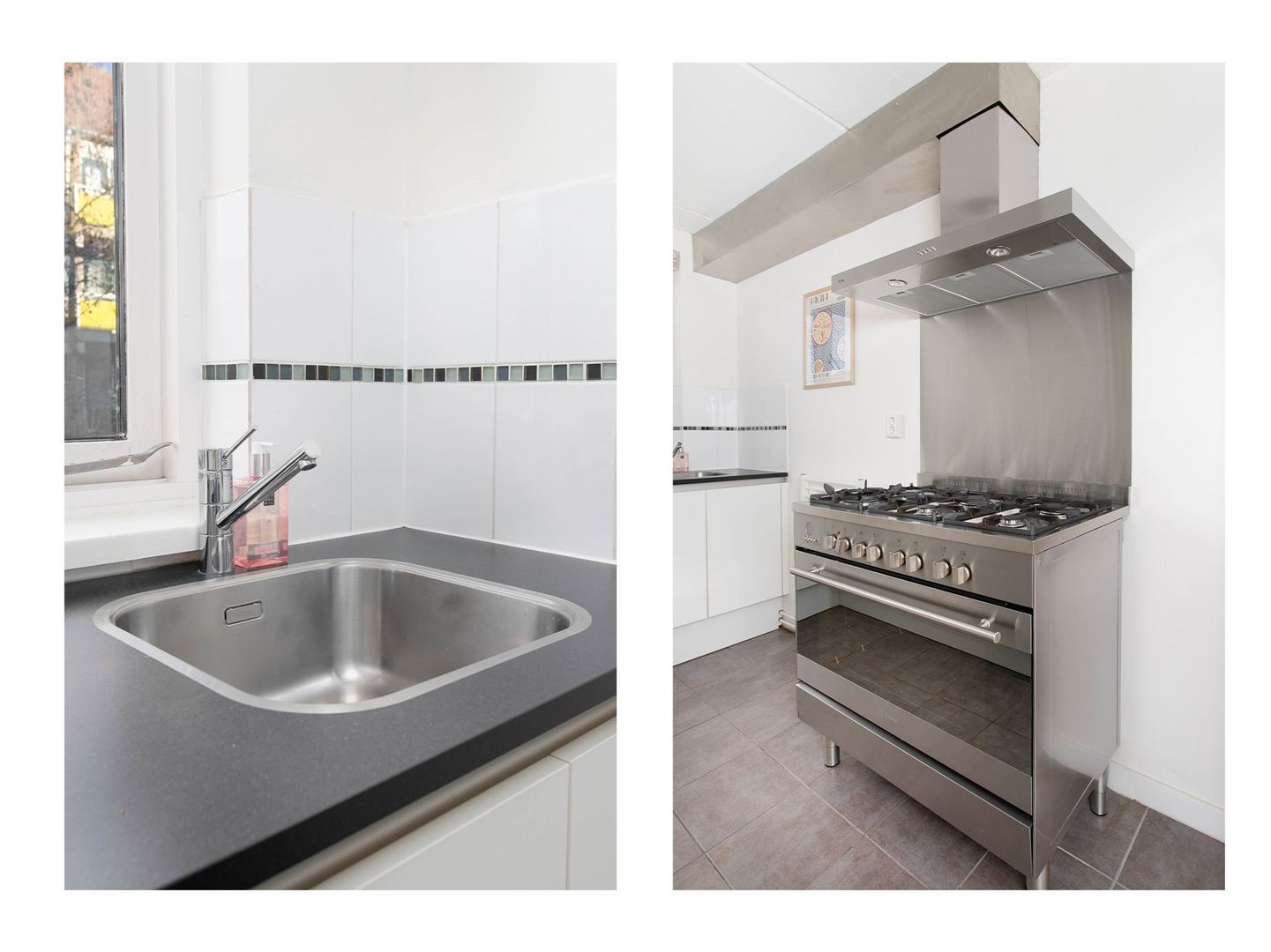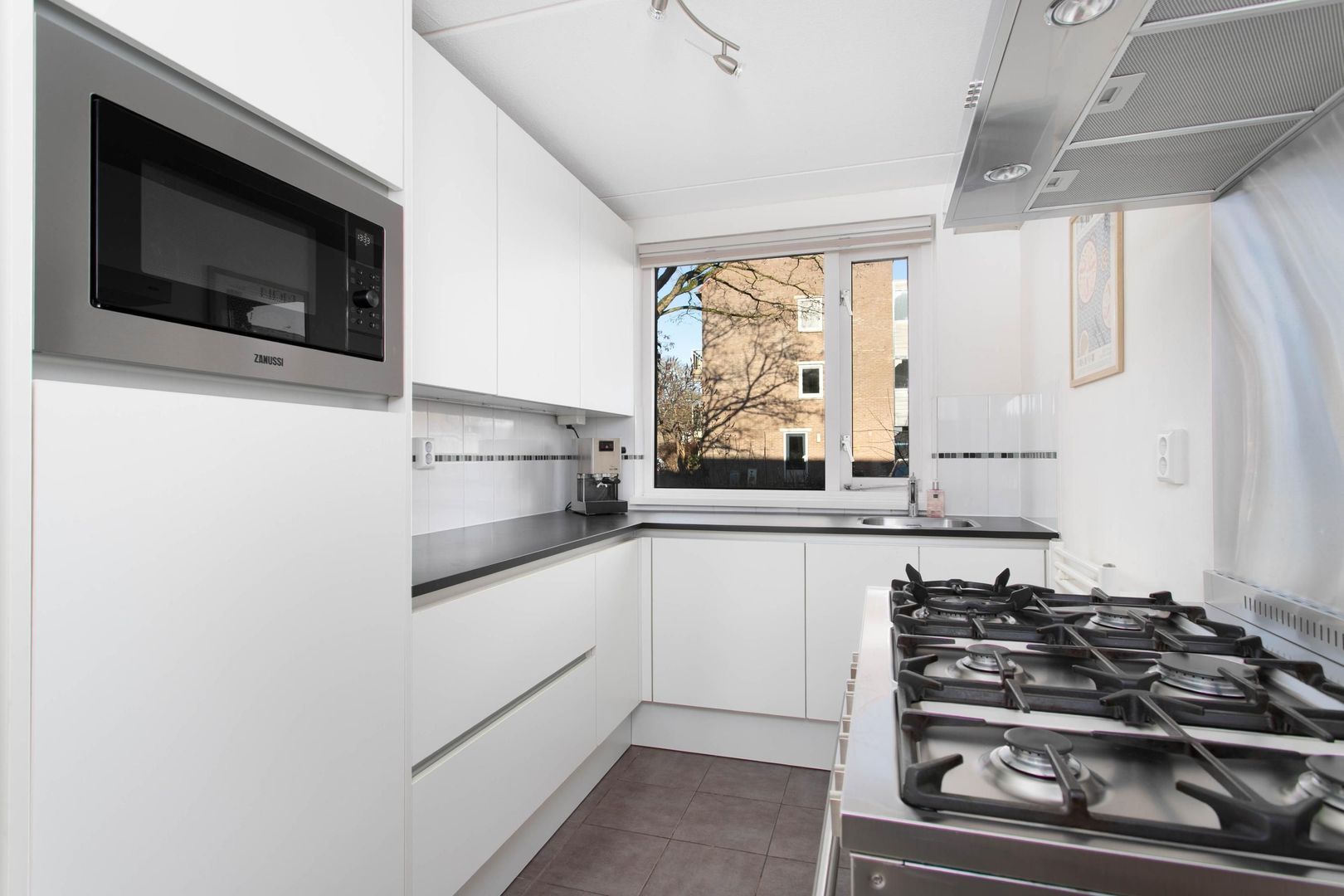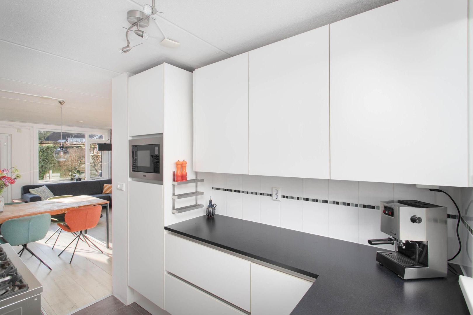 De keuken is aan de voorzijde gelegen en kijkt leuk weg over de straat. Het betreft een L-vormige keuken met de volgende inbouwapparatuur: 6-pits gaskookplaat, afzuigkap, koelkast, oven, magnetron en een vaatwasser. Het zwart-grijze aanrechtblad combineert goed met de witte keukenkasten en tegelwerk.