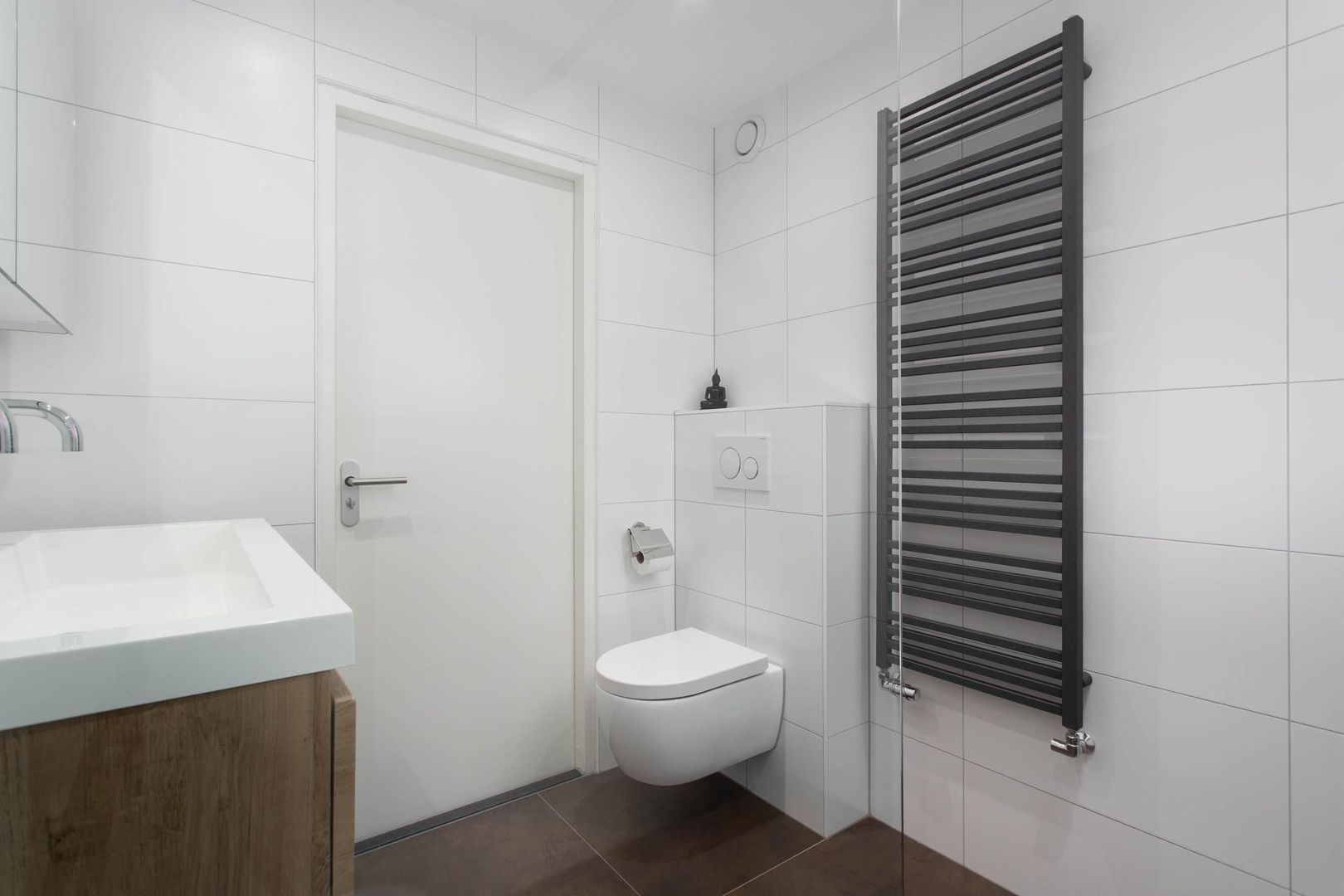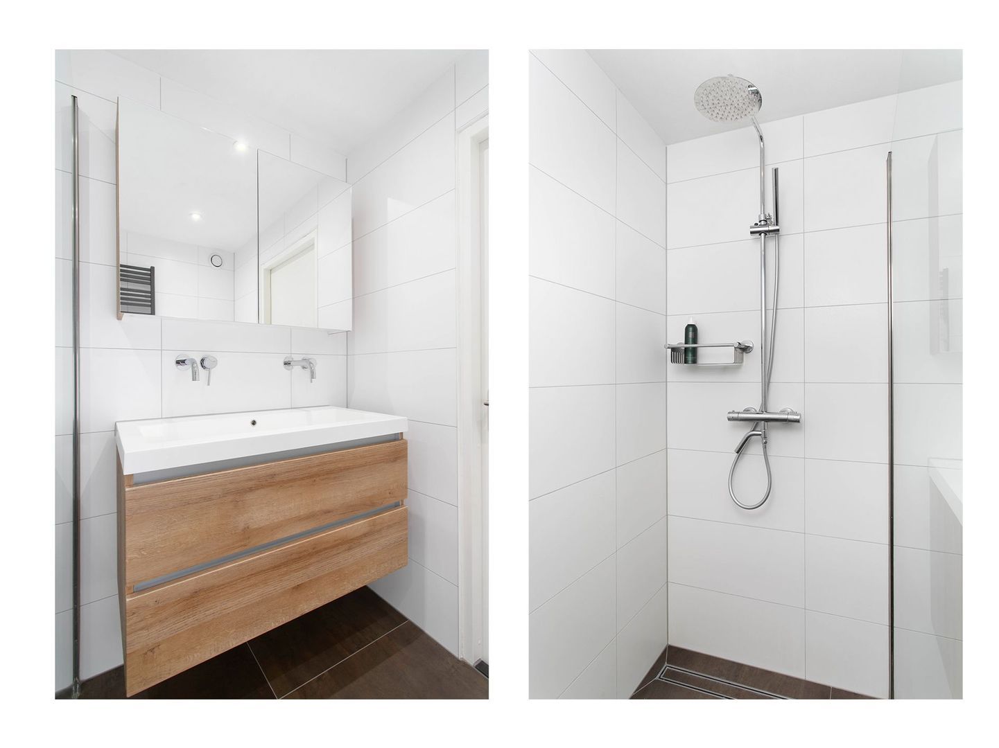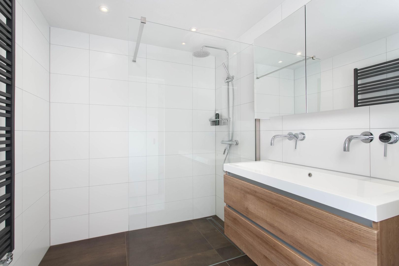 De moderne badkamer is voorzien van grote inloopdouche, dubbele wastafelmeubel met een spiegelkast, tweede toilet en een designradiator. De badkamer heeft een moderne uitstraling met bruine tegels op de vloer en witte tegels aan de wand, welke tot aan het plafond zijn betegeld.