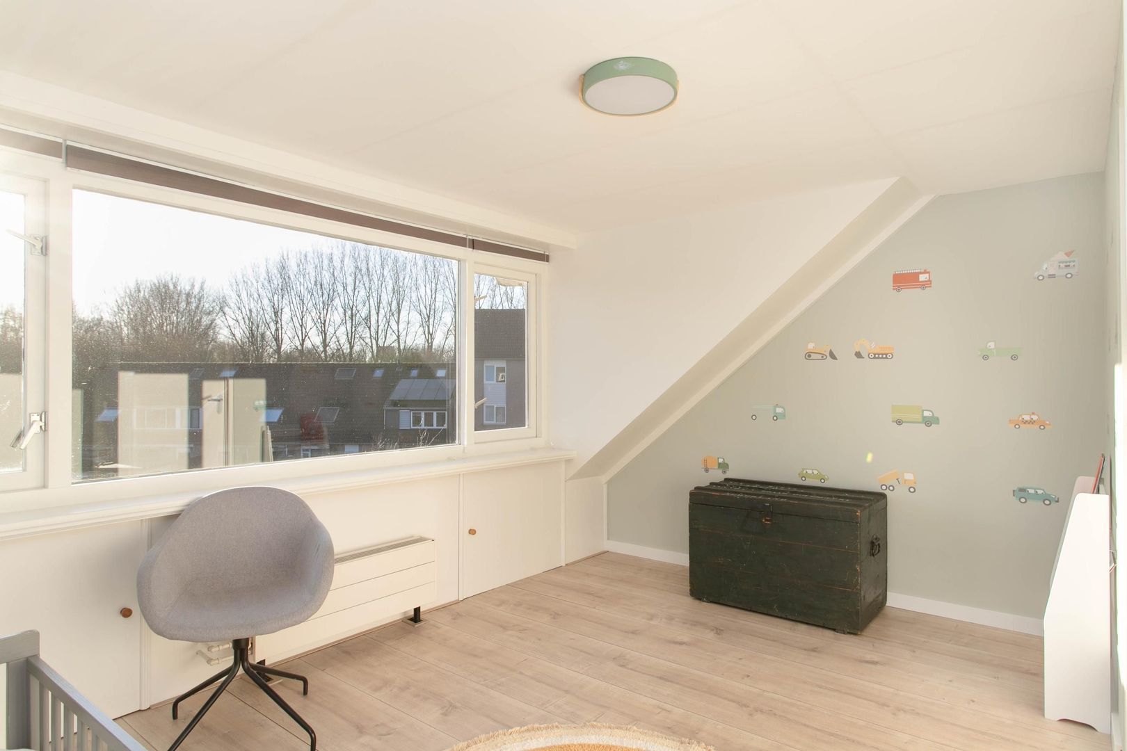 De hoofdslaapkamer is aan de achterzijde gelegen en beschikt over groot raam voor een optimale lichtinval. De kamer is ruim genoeg voor een royaal tweepersoonsbed en een grote kledingkast. De andere kamer is aan de voorzijde gelegen en is nu in gebruik als kinderkamer. De gehele eerste verdieping is voorzien van een laminaatvloer.
