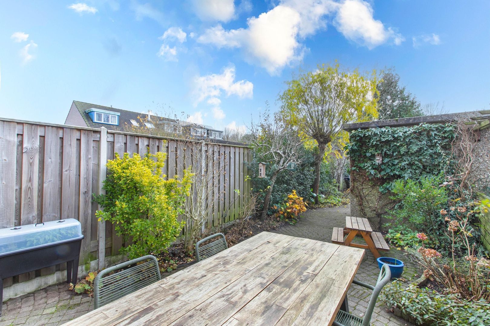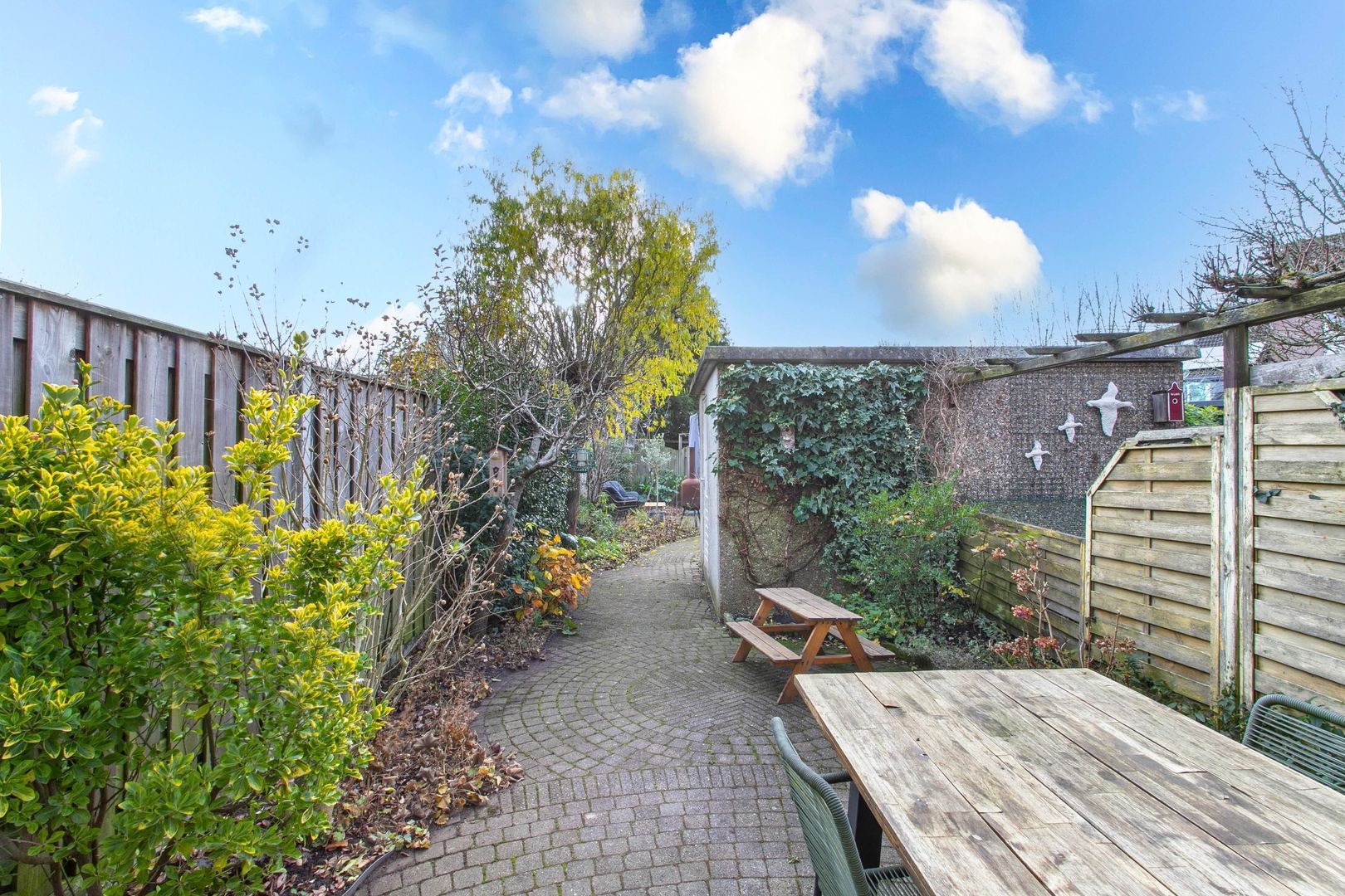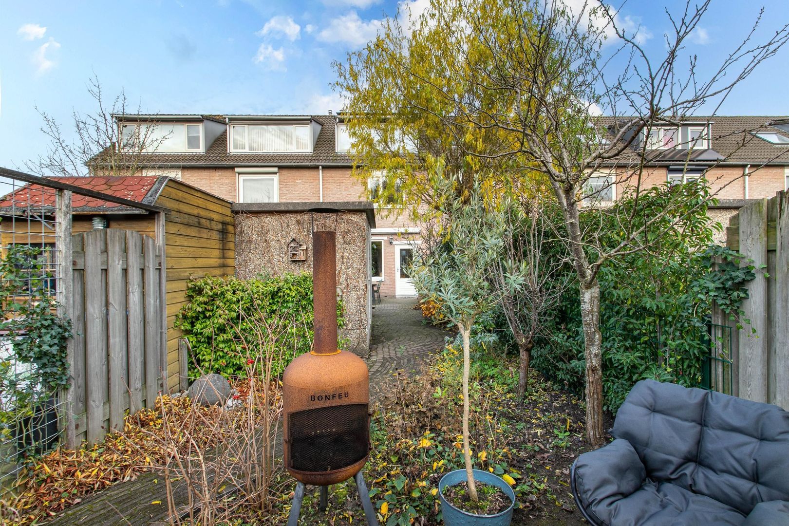 Zeer diepe en royale tuin waar u heel wat dagen kunt genieten van de zon en uw vrije uren. De tuin biedt veel privacy door de ligging en is voorzien van sierbestrating en veel groen. Tevens treft u hier een achterom en een vrijstaande stenen berging met elektra. Achter de berging bevindt zich nog een lekker zitje, waar je lekker je kopje koffie of thee kunt nuttigen.