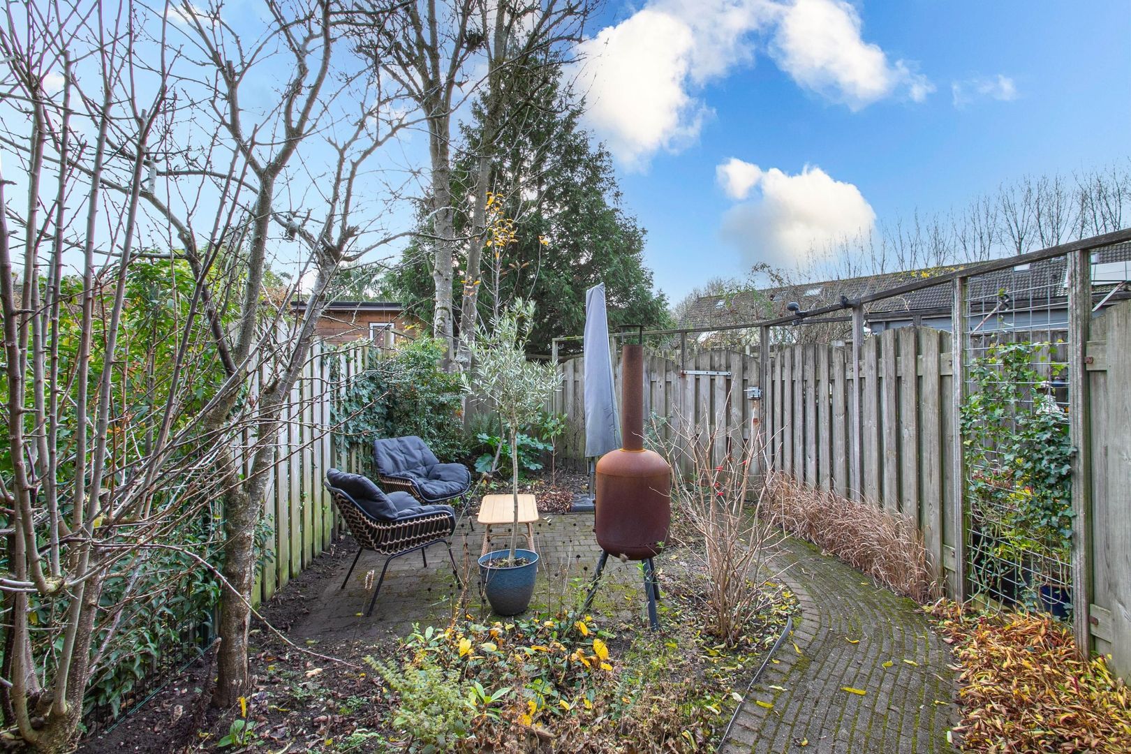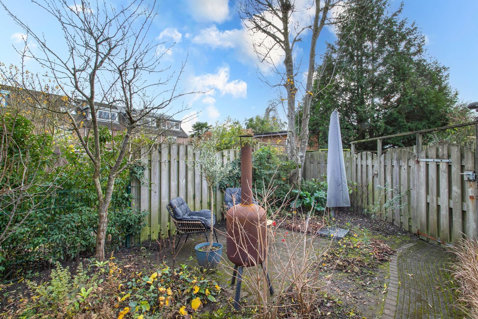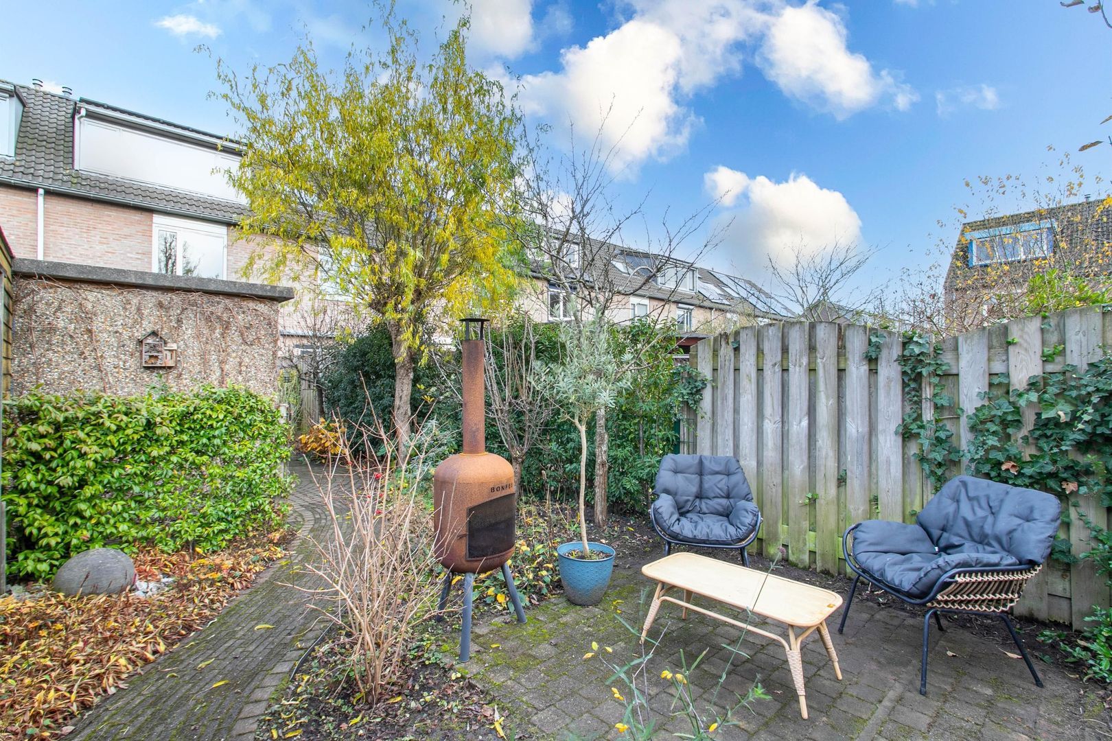 Zeer diepe en royale tuin waar u heel wat dagen kunt genieten van de zon en uw vrije uren. De tuin biedt veel privacy door de ligging en is voorzien van sierbestrating en veel groen. Tevens treft u hier een achterom en een vrijstaande stenen berging met elektra. Achter de berging bevindt zich nog een lekker zitje, waar je lekker je kopje koffie of thee kunt nuttigen.