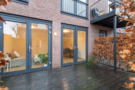 Stap binnen in dit heerlijke lichte appartement met voor- en achtertuin gelegen op het zuidwesten. Je komt binnen via de voortuin in de lange hal met meterkast, garderobe, badkamer en een aparte toiletruimte. Vanuit de hal loop je door naar de sfeervolle woonkamer, welke volledig is voorzien van nieuw laminaat (2023) en dankzij de grote ramen veel daglicht binnenlaat. Via de achterdeur stap je zo de royale achtertuin in.
