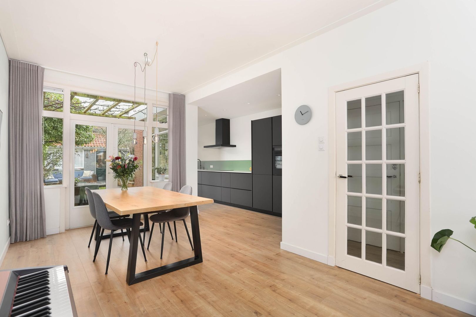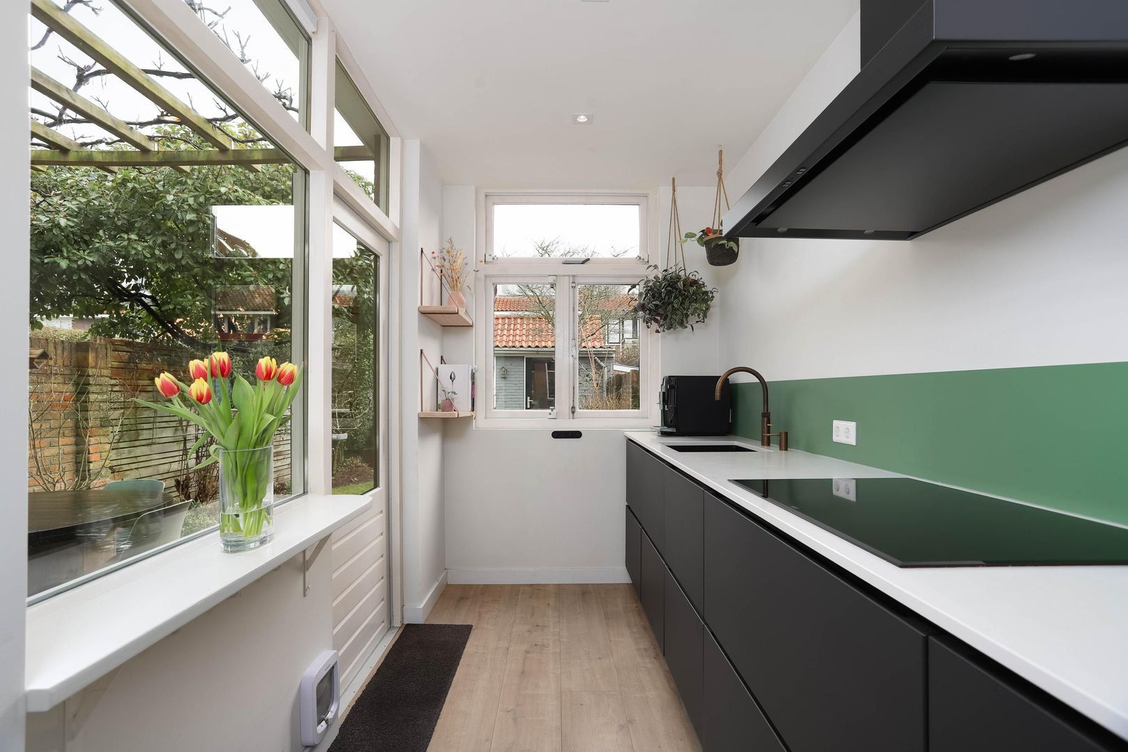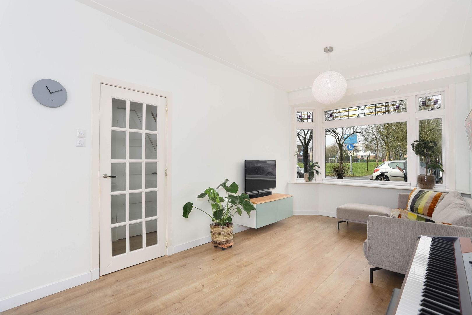 De lichte en ruime woonkamer valt direct op door de grote raampartijen, fraaie laminaatvloer en hoge plinten. De openslaande deuren verbinden binnen moeiteloos met buiten en geven toegang tot de groene achtertuin. Aan de voorzijde zorgt de erker met glas-in-loodramen voor extra charme en karakter. In de uitbouw bevindt zich de luxe keuken, welke modern is uitgevoerd voorzien van alle benodigde inbouwapparatuur. Vanuit de keuken bereik je eveneens de achtertuin.