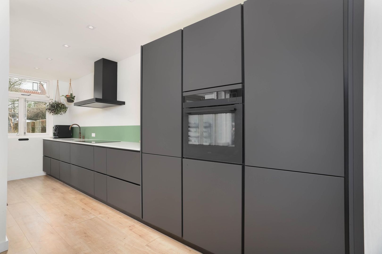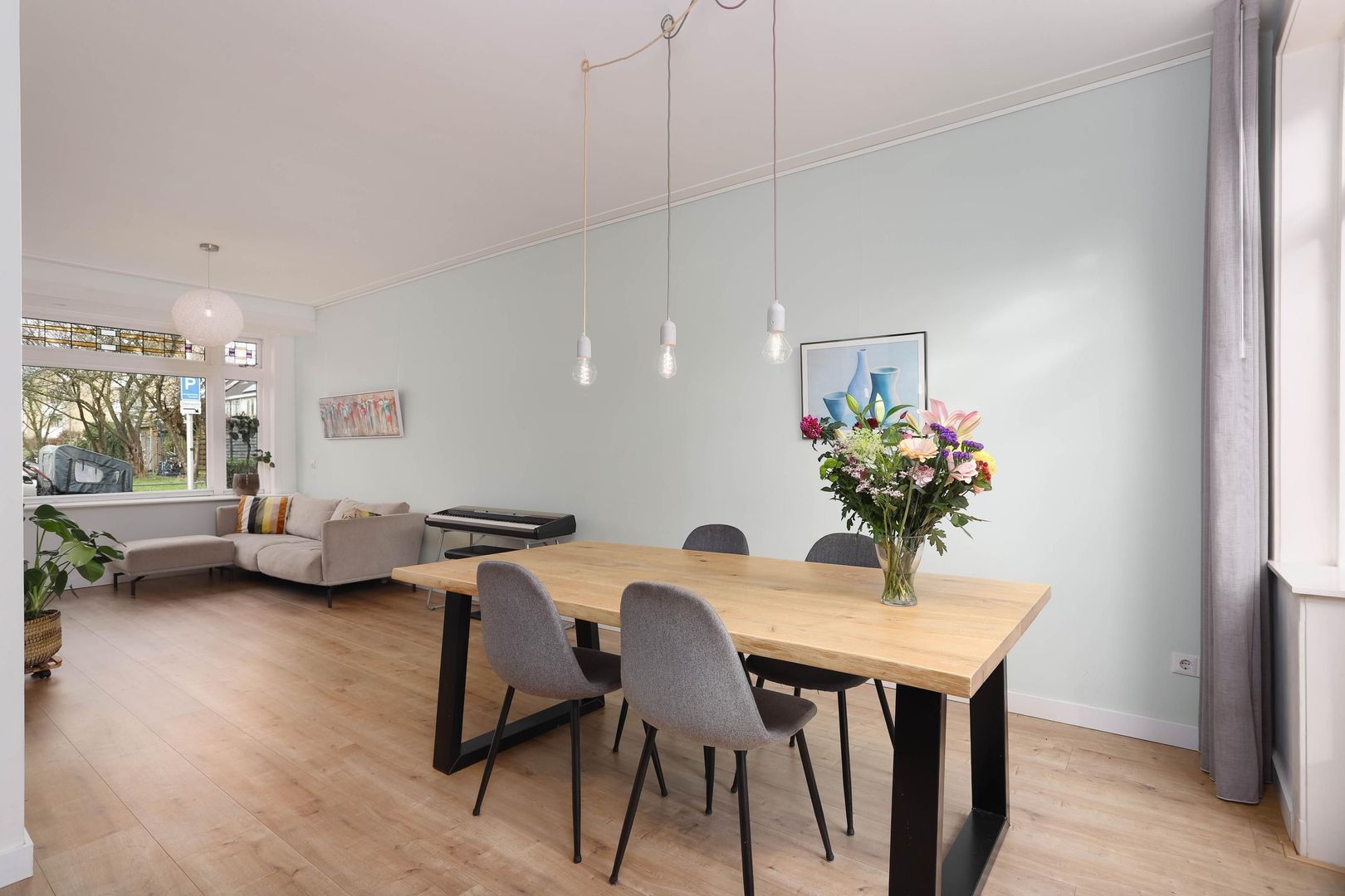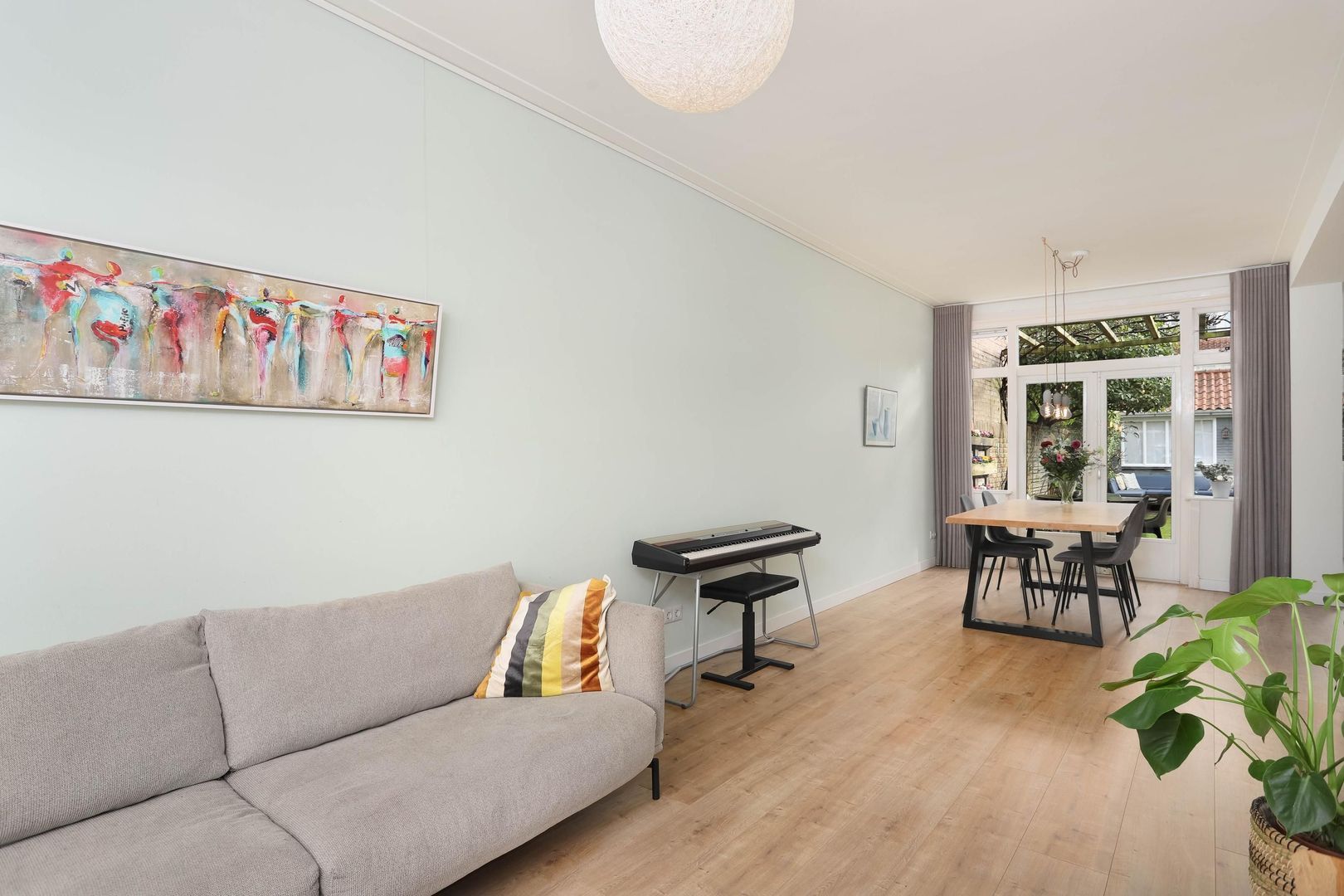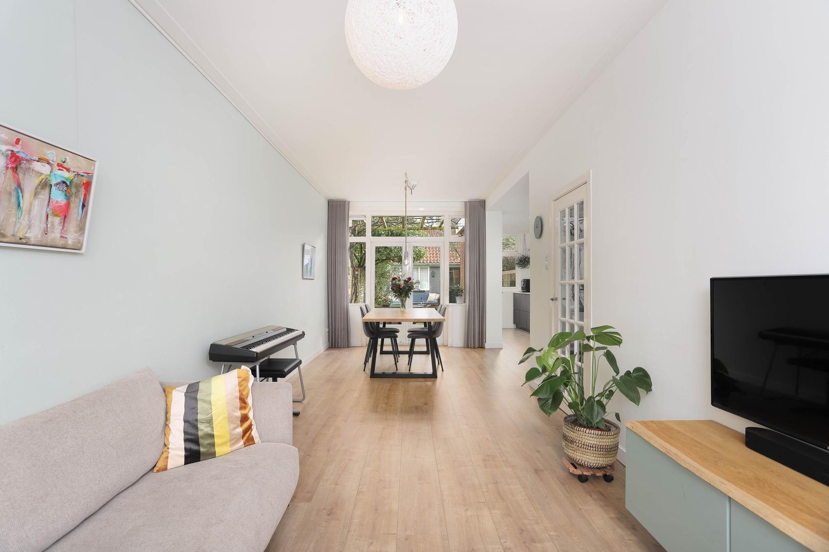 De lichte en ruime woonkamer valt direct op door de grote raampartijen, fraaie laminaatvloer en hoge plinten. De openslaande deuren verbinden binnen moeiteloos met buiten en geven toegang tot de groene achtertuin. Aan de voorzijde zorgt de erker met glas-in-loodramen voor extra charme en karakter. In de uitbouw bevindt zich de luxe keuken, welke modern is uitgevoerd voorzien van alle benodigde inbouwapparatuur. Vanuit de keuken bereik je eveneens de achtertuin.