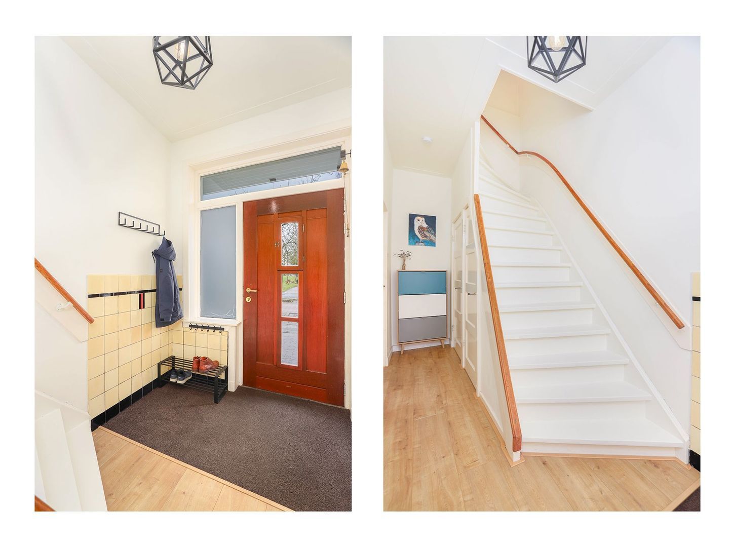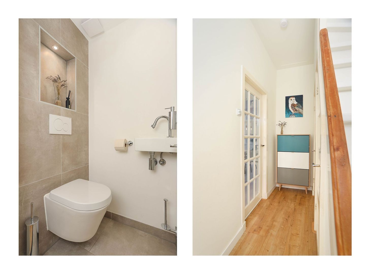 Via de entree kom je in de ruime hal met vaste kast onder de trap, meterkast en trapopgang naar de eerste verdieping. Verder bevindt zich onder de trap een moderne, vrijhangende toilet met wastafel welke strak is afgewerkt.