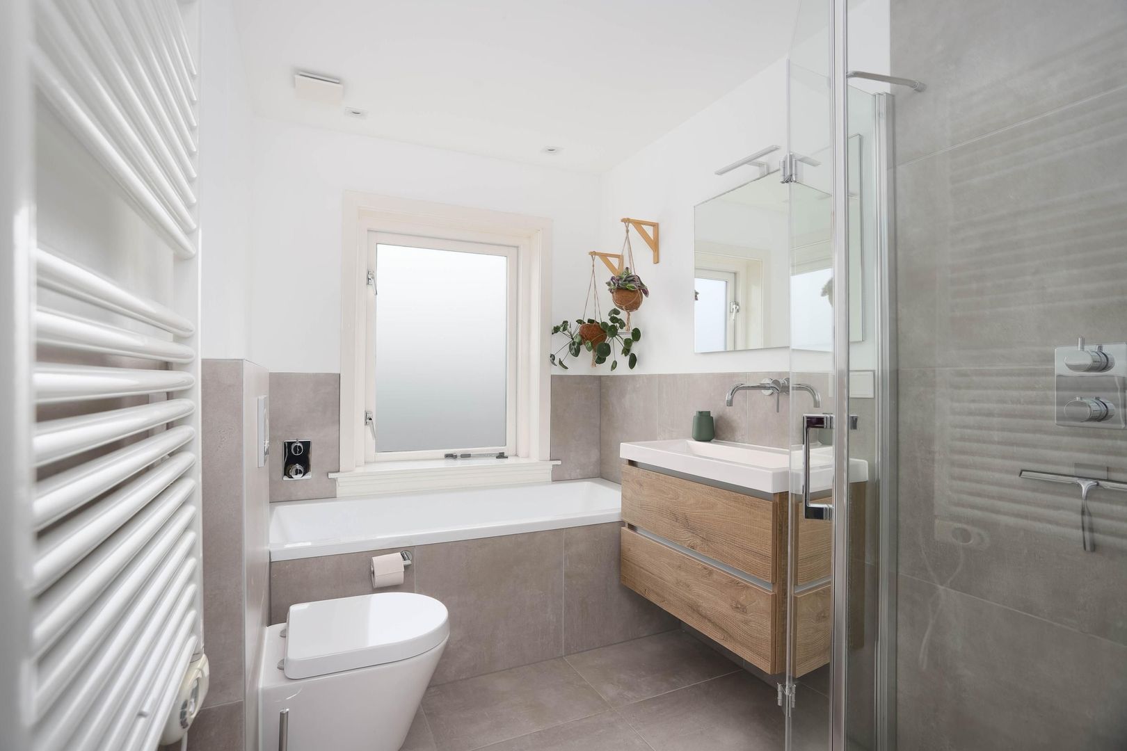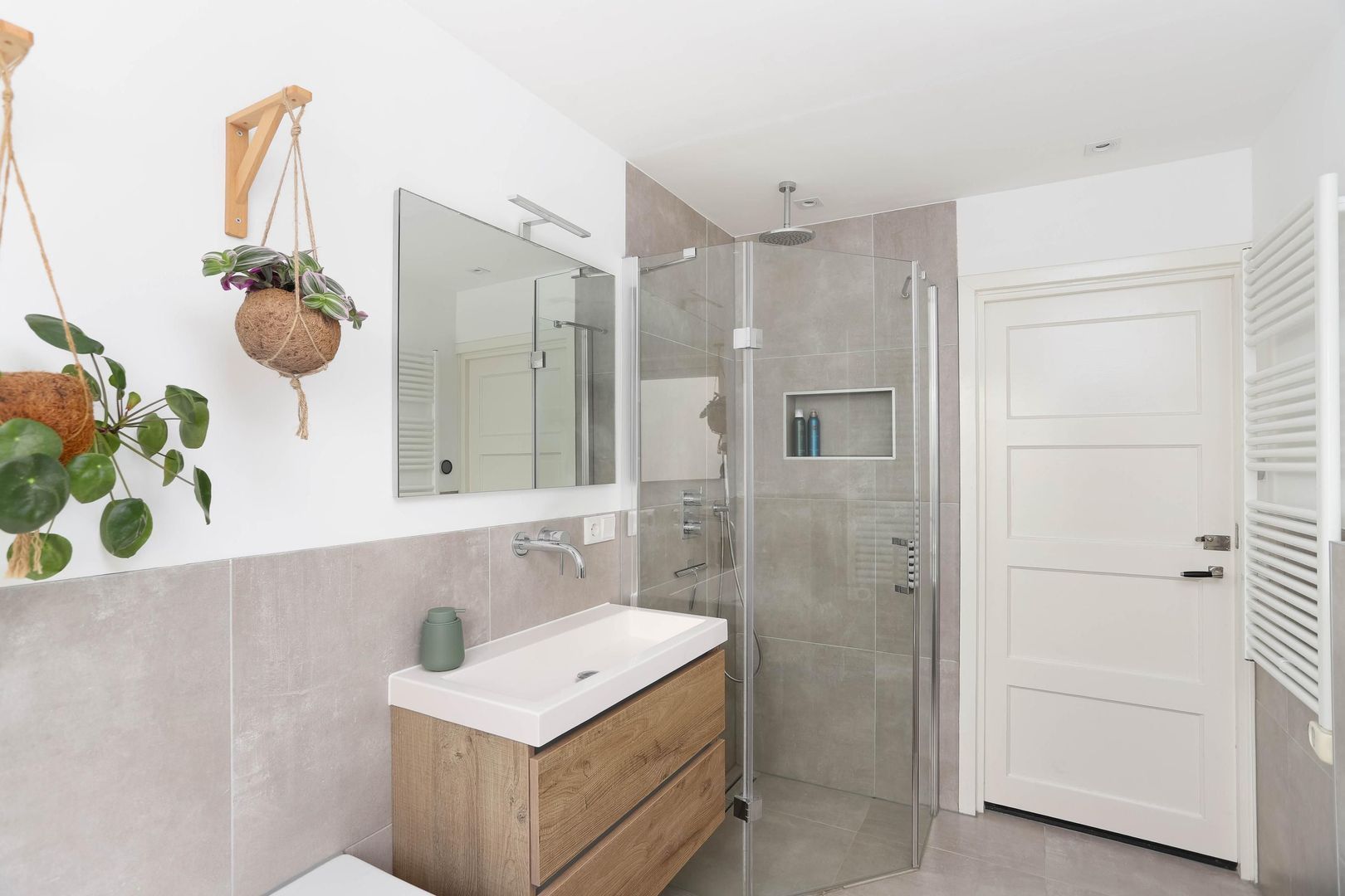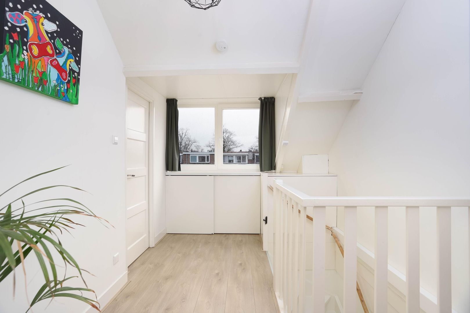 De overloop geeft toegang tot drie slaapkamers en de badkamer. Op de overloop bevinden zich een bergkast en een vaste kast met aansluiting voor wasmachine en droger. De moderne badkamer is compleet uitgerust met een inloopdouche, ligbad, wastafelmeubel, vrijhangend toilet en designradiator. De gehele eerste verdieping is voorzien van vloerverwarming. Alle drie de slaapkamers zijn netjes afgewerkt met een laminaatvloer en strak gestucte wanden. Twee slaapkamers zijn ruim van formaat en beschikken over praktische inbouwkasten, terwijl de derde kamer ideaal is als kinder-, werk- of kleedkamer.