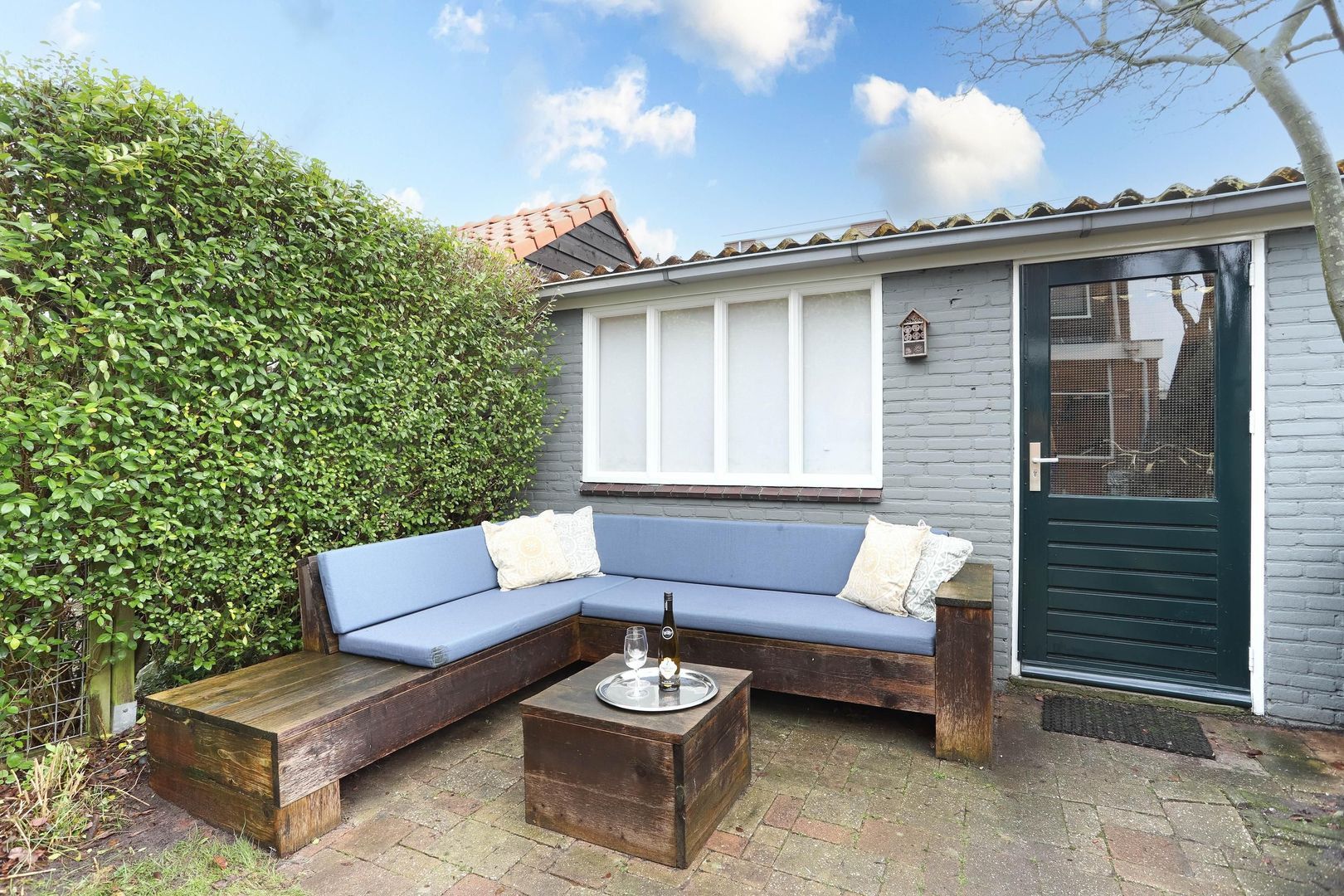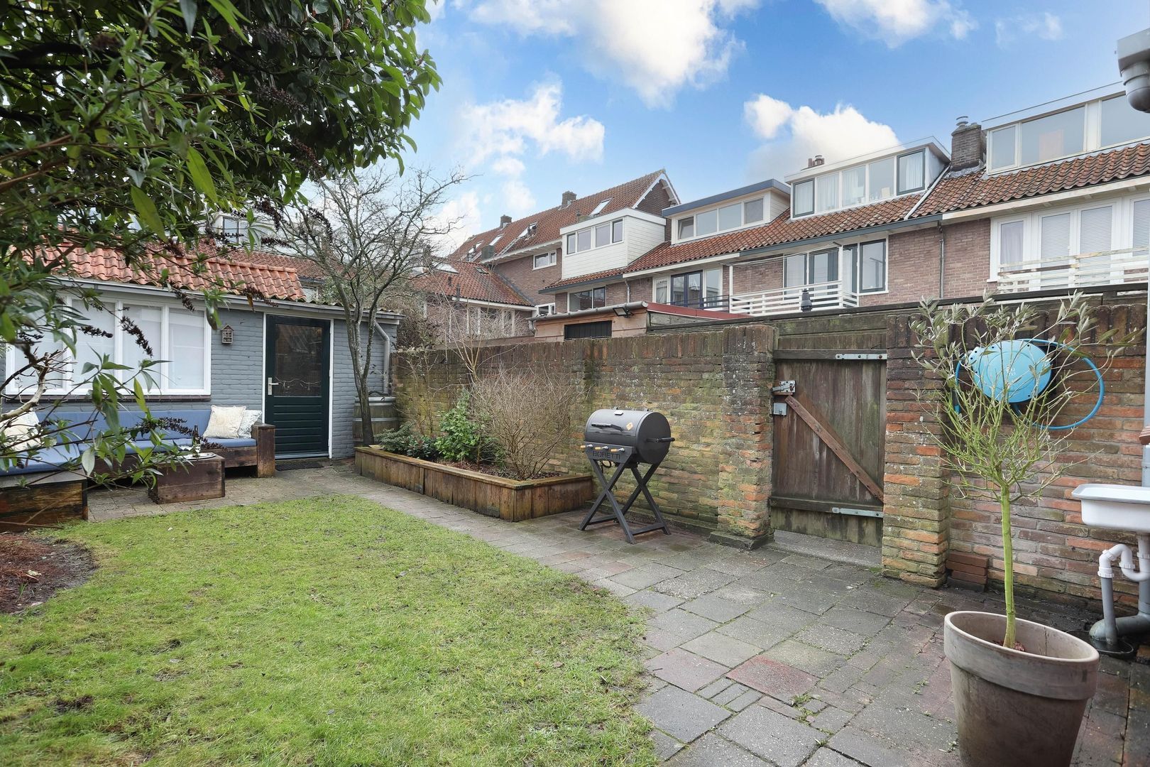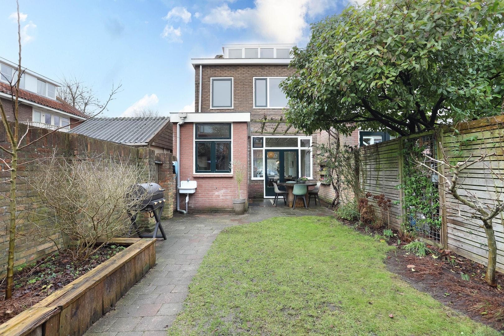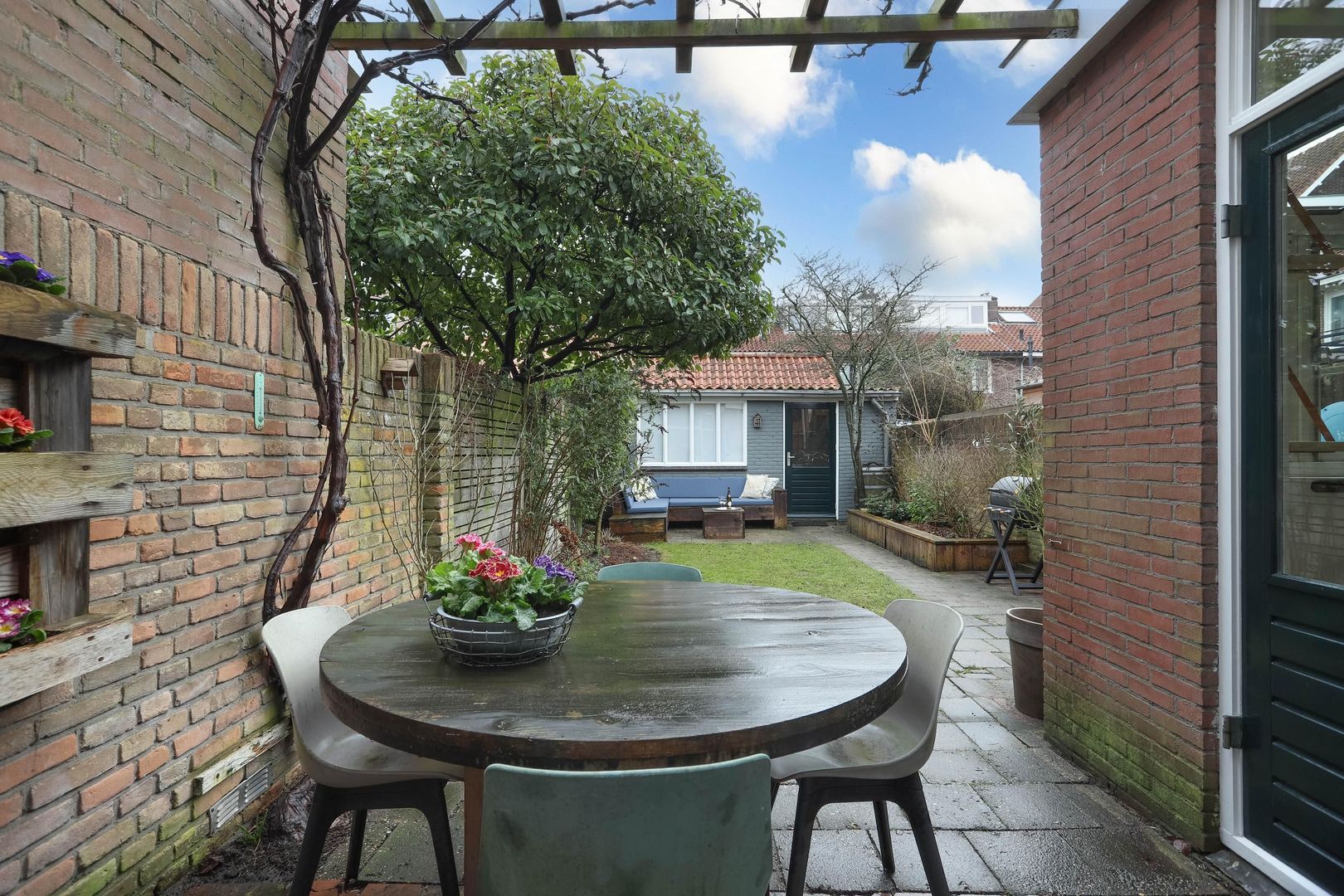 De diepe achtertuin biedt volop privacy en heeft gedurende het jaar zowel plekken in de zon als in de schaduw, met een mooie druivenpergola die voor natuurlijke schaduw zorgt. Achterin de tuin bevindt zich een ruime stenen berging, voorzien van elektra. Verder heeft de tuin een achterom.
