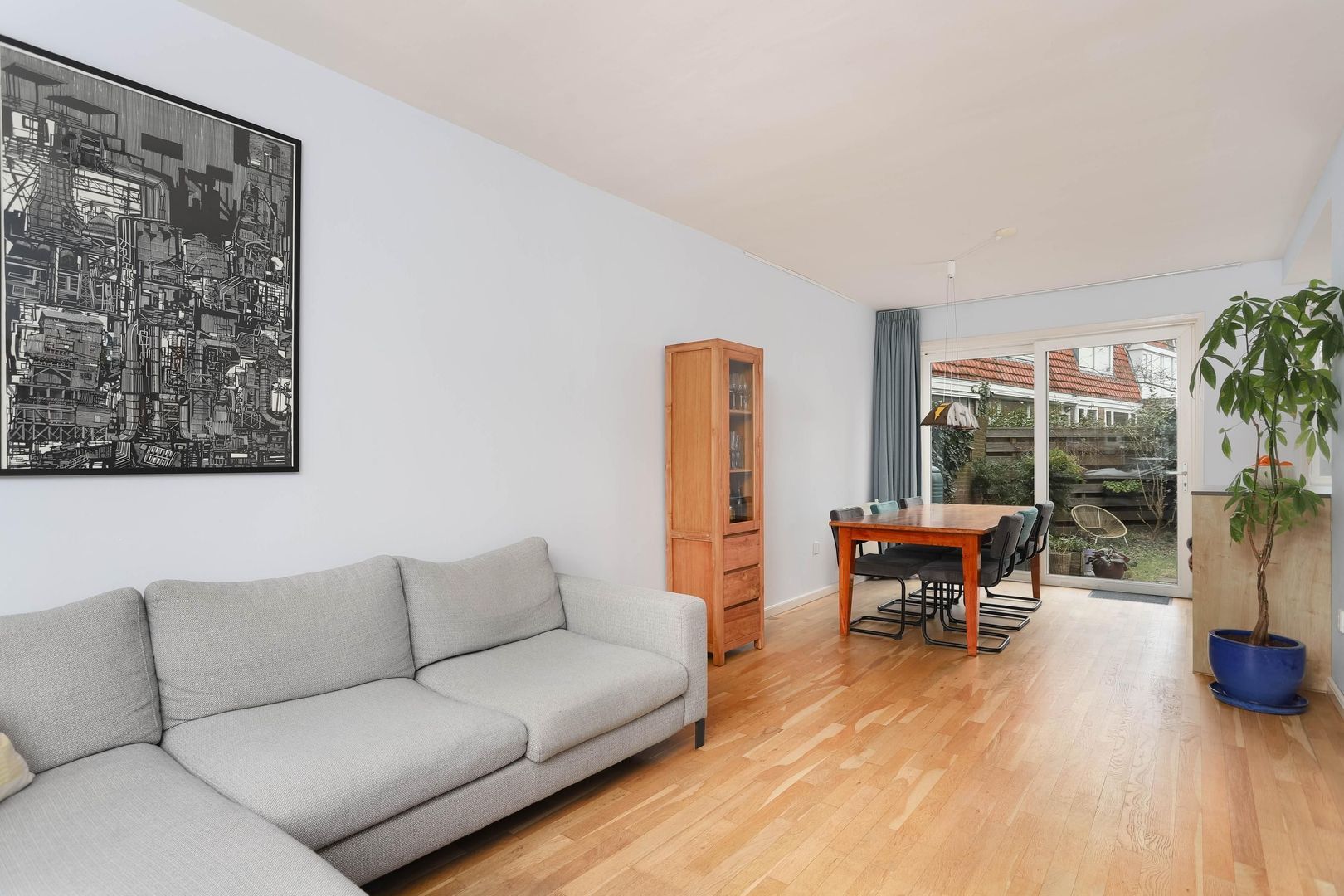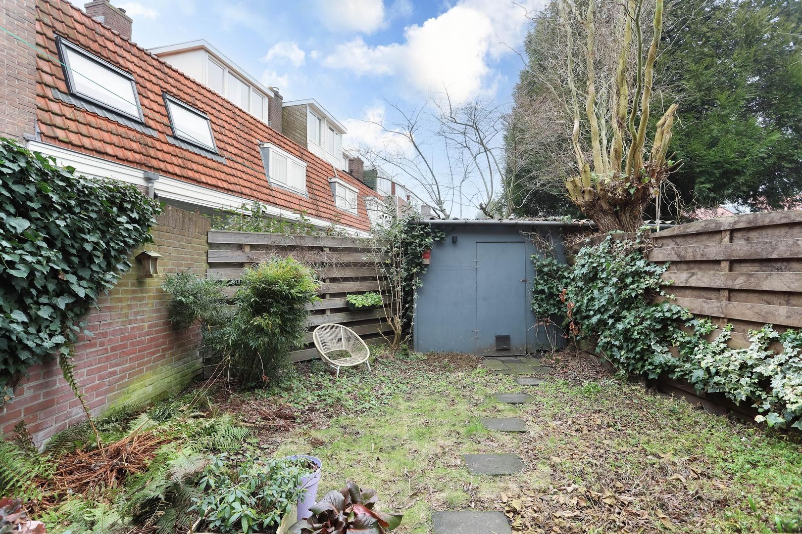 Vanuit de woonkamer stap je zo de ruime tuin in, gelegen in een unieke punt. De tuin biedt volop privacy en ruimte om meerdere zitplekken te creëren. Achterin bevindt zich een praktische schuur met extra bergruimte, ideaal voor fietsen en tuinspullen.