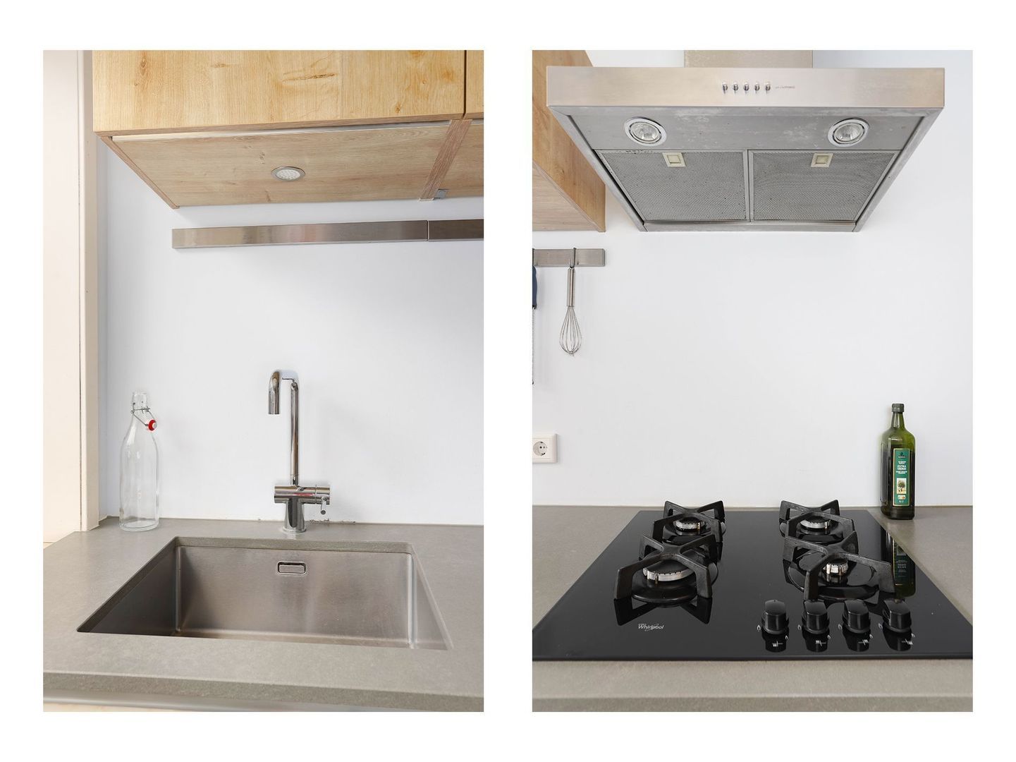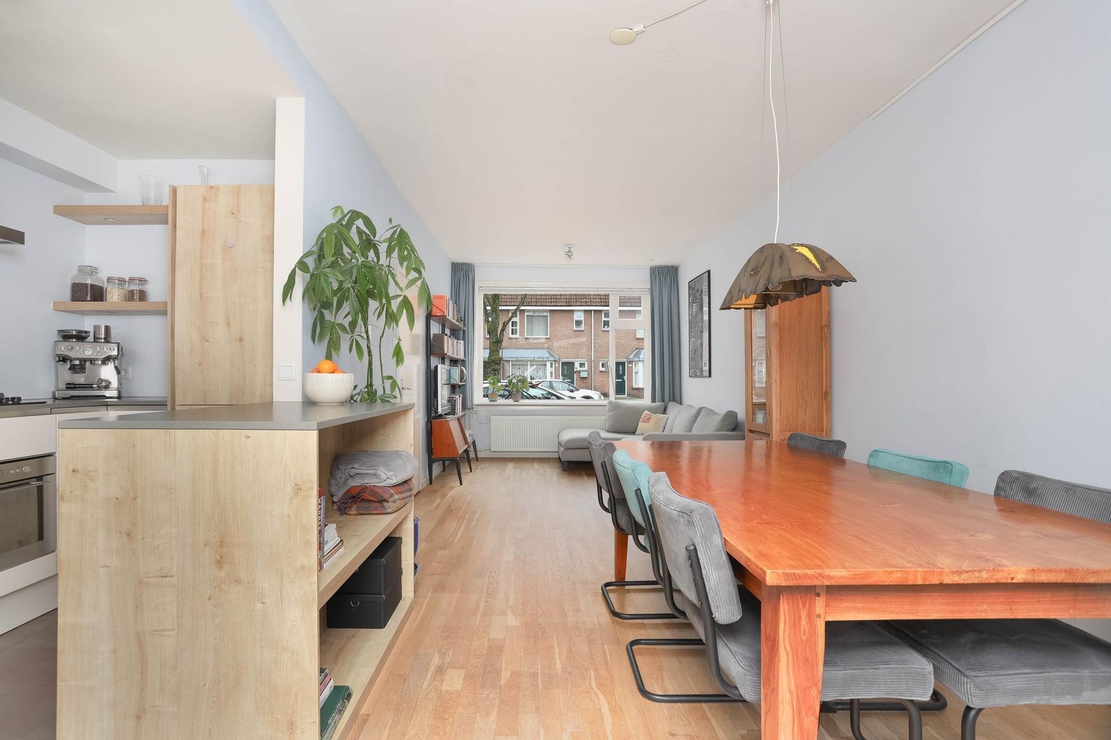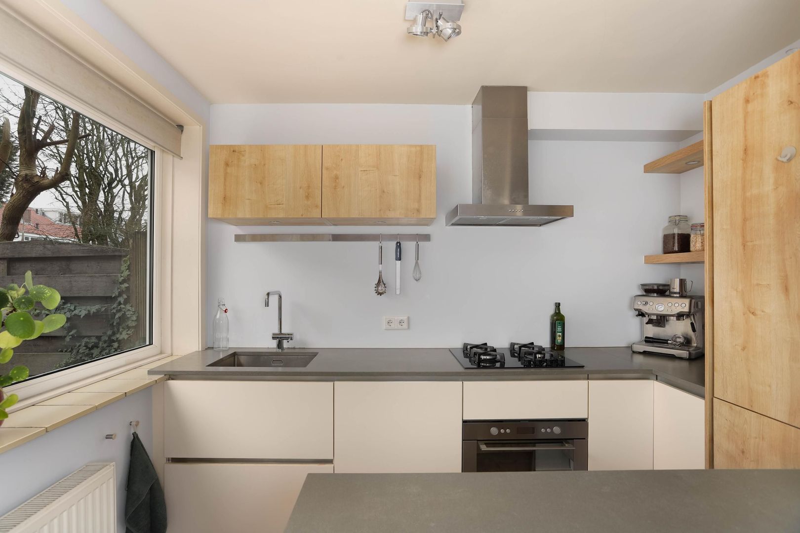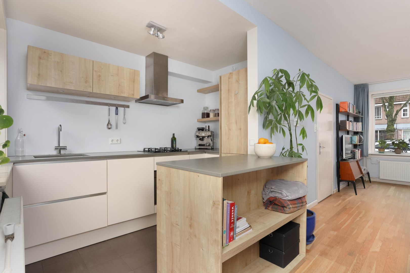 De moderne half open keuken is uitgevoerd met een stijlvol kookeiland en voorzien van diverse inbouwapparatuur, waaronder een gasfornuis, oven en een afzuigsysteem. Een perfecte plek om te koken én gezellig samen te komen.